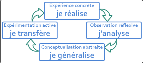 L’approche de Kolb peut être un cadre structurant pour identifier les différents temps de la formation. Ce cycle qui se rapproche de la logique de l’amélioration continue donne un cadre pour l’enchaînement des étapes de la formation avec 4 temps distincts :