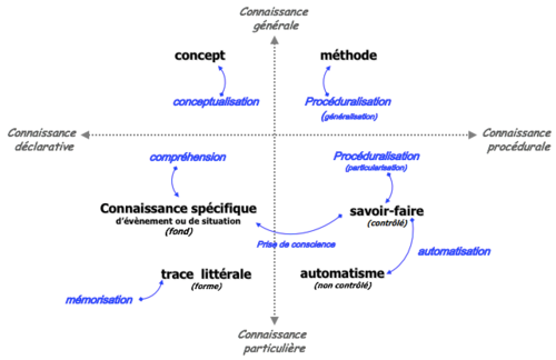Prise de conscience | Élaboration d’une connaissance déclarative de quelque chose que l’on sait faire. Ce processus est soutenu par l’analyse de l’action et l’explicitation. |