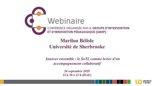 Ce webinaire présentera la démarche d’accompagnement collaboratif mise en œuvre dans l’i2P, une démarche de recherche-action axée sur le développement d’une expertise sur l’enseignement et l’apprentissage appelée le Scholarship of Teaching and Learning (SoTL ; Bélisle et al., 2016). Des exemples de projets d’innovation seront discutés, de même que les retombées de la démarche sur les porteurs et porteuses de projet et leur milieu.