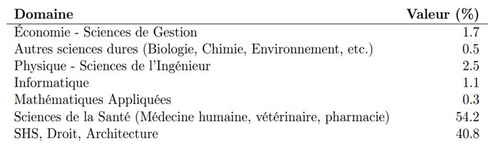 Pour identifier la thématique d’un manuscrit, la personne en charge de poster le document doit choisir parmi une liste de labels préexistants, sachant qu’elle peut en sélectionner plusieurs – notamment dans le cas d’un travail interdisciplinaire – et que l’on peut décider du niveau de précision de la caractérisation via une arborescence. Ainsi, l’on peut rester à la base de l’arborescence, en choisissant sciences humaines et sociales (SHS) – de niveau 0, ou choisir un label plus détaillé, comme SHS/Sciences de l’éducation – de niveau 1. La Table 1 présente l’importance relative des principaux champs de niveau 0, après recodage, et que nous regrouperons par la suite de manière sensiblement différente.