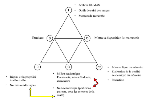 Comme ces auteurs, nous partons du principe que la possibilité de voir son travail consulté et repris constitue a priori pour les étudiants de master une raison de mettre en libre accès leur travail sur DUMAS. Notre hypothèse est que l’on peut s’attendre à ce que certains individus sensibles à la question de la diffusion de leur mémoire, à plus forte raison s’ils ne se projettent pas dans une carrière académique, soient pris entre la volonté d’être reconnus au sein du milieu académique d’une part, ce qui signifie se plier aux normes afférentes, et la recherche de visibilité auprès du plus grand nombre d’autre part, au-delà du seul milieu académique. Cette considération nous amène à la question suivante : Quelles contradictions potentielles, au sens de Engeström (1987), peuvent-elles émerger de l’opportunité, pour les étudiants, de voir leur mémoire diffusé aussi bien au sein du milieu académique qu’en dehors de celui-ci ? Le terme potentielles utilisé ici vise à préciser le fait que l’on se concentre sur les conséquences possibles de certaines tendances que nous allons mettre au jour empiriquement, conséquences suggérées par la littérature scientifique et qu’il faudra démontrer lors de recherches ultérieures.