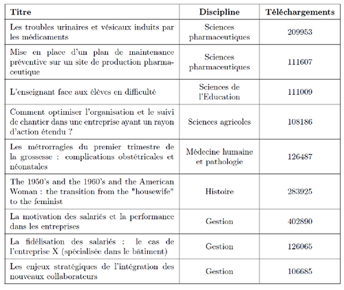 Table 2. Titre et discipline des mémoires ayant cumulé plus de 100 000 téléchargements sur l’archive DUMAS à date du 23 décembre 2023.