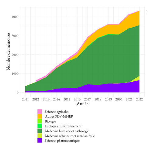 Figure 1. Evolution du nombre de manuscrits disponibles sur Dumas dans les sous-disciplines des champs Sciences du Vivant / Médecine Humaine et Pathologie (SDV-MHEP)