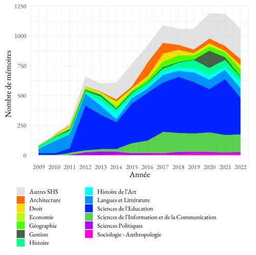Figure 2. Évolution du nombre de manuscrits disponibles sur Dumas dans les sous-disciplines catégorisées comme relevant, dans la base, des sciences humaines et sociales (SHS)