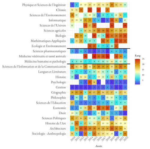 Figure 3. Évolution du rang de vingt-cinq disciplines en matière de nombre de téléchargements des mémoires de DUMAS, ce rang étant calculé pour une année de production de mémoire donnée