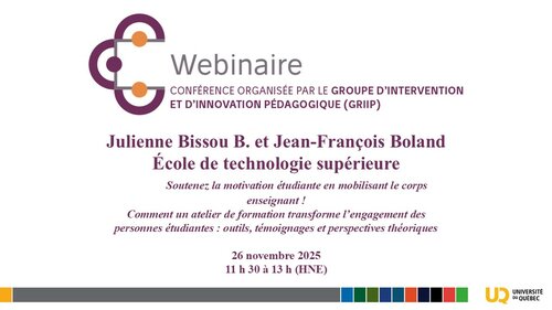 Ce webinaire présentera les effets d’un atelier de formation offert à des membres du corps enseignant sur la motivation et l’engagement des étudiantes et étudiants à l’École de technologie supérieure (ÉTS). La démarche s’appuie sur une analyse réflexive des différences de perception entre les départements de génie à l’ÉTS concernant la motivation de la communauté étudiante. Ceci illustrant des enjeux institutionnels importants pour maximiser la réussite étudiante. Le cadre théorique de Viau (2009) sert de référence : la dynamique motivationnelle est analysée à travers ses déterminantes et ses sources. Selon une démarche de recherche-action, l’atelier de formation, associé à l’implication du corps enseignant, sert de levier pour analyser les effets sur la motivation et l’engagement non seulement des étudiantes et étudiants, mais aussi du personnel enseignant et de la communauté universitaire. Le témoignage d’un professeur viendra enrichir la présentation par un partage de pratiques et de ressources pour stimuler la motivation, soutenir l’engagement et encourager la réflexion sur l’évolution et l’effet des pratiques pédagogiques.