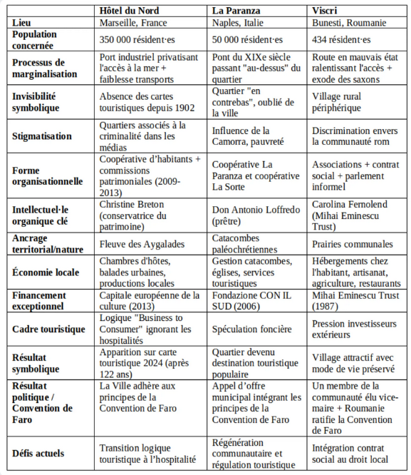 Dans le nord de Marseille, des quartiers entiers ont été littéralement effacés des cartes touristiques de la ville. À Naples, le chômage des jeunes dans le Rione Sanità a pu atteindre 60 %. À Viscri, en Roumanie, une communauté rom vivait à proximité d’un site du patrimoine mondial de l’UNESCO dont elle était exclue de la gestion. Il ne s’agit pas seulement d’informations témoignant du mépris à l’endroit de ces lieux et de leurs habitants, ce sont des récits qui questionnent qui décide de ce qui compte, qui bénéficie du patrimoine culturel et des ressources locales, et qui est laissé pour compte.