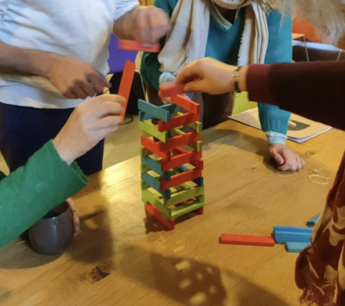 La première après midi, on leur fait jouer à un jeu de kaplas. On donne aux personnes des kaplas de couleurs différentes et on fait trois groupes. Chaque groupe doit faire une tour de kaplas la plus haute, avec le moins possible de kaplas. Ils font de jolies tours, en général, très belles. Et ensuite on leur révèle, ça, ils ne le savaient pas, car typiquement, on est en mode performance, et donc on on leur révèle que les kaplas verts, c’est plutôt l’environnement, les kaplas bleus, plutôt le social, et les kaplat rouges, plutôt les personnes. Et là on tire au sort des fluctuations, il y a le plus grand employeur de la ville de Brest, qui vient de tout liquider, du coup, il y a un impact au niveau social, donc vous devez enlever 2 kapla social. Et puis il y a plein de personnes qui sont en dépression, et donc vous devez enlever 3 kapla bleu.En faisant cela, on s’aperçoit que plus vous avez une tour performante, plus, dès que vous avez des fluctuations, cela va se casser la figure.