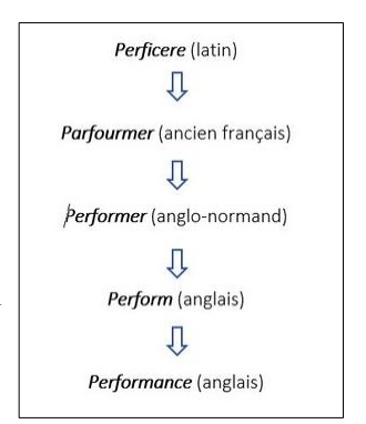 C’est un terme anglais introduit en France au 19e siècle et utilisé essentiellement dans le monde très restreint des courses de chevaux. Il dérive du verbe anglosaxon « to perform », qui signifie « accomplir ». Ce terme a traversé la Manche plusieurs fois, puisque ses racines remontent au mot « parfourme » en ancien français lui- même dérivé du de « perficere » en latin.