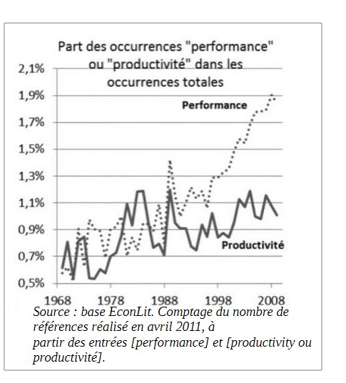 L’économiste Florence Jany-Catrice observe dans sa discipline un glissement progressif d’analyses portant sur la productivité à celles, plus larges, portant sur les performances avec un vrai décrochement à partir des années 80. Elle l’explique par le besoin d’un nouveau mot pour remplacer et élargir le terme de productivité notamment pour rendre compte de l’e cacité de la production de services. Elleffi s’appuie notamment sur l’observation de l’évolution d’occurrence des termes productivité et performance dans la base de références bibliographiques EconLit mise en place par l’American Economic Association (Jany-Catrice, 2012).
