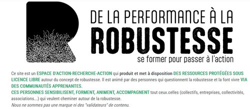 Dans une démarche de coopération ouverte un espace collaboratif larobustesse a été initié par Gatien Bataille et Laurent Marseault en2024. C’est un espace ressource aux contenus délibérément partagés et protégés par une licence Créative commons by sa qui participent par leur réutilisation encouragée à la diffusion des concepts de robustesse et de santé commune. Le fonctionnement en collectif ouvert "ils peuvent en parler" adossé à des formations de 4 jours pour partager une expérience commune forme l’ossature d’une communauté apprenante de personnes soucieuse de s’impliquer collectivement et en "partage sincère" autour de la robustesse. C’est ainsi que des dizaines de ressources (trames de conférences, d’animations..) ont été déposées depuis un an par une trentaine de contributeurs.