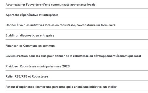 Quelques propositions, formulées lors d’une première rencontre le 14 janvier devraient se concrétiser au printemps dans un collectif qui compte aujourd’hui une quinzaine de personnes. Un temps fort pour cette communauté sera le prochain Forum des usages coopératifs dont un des thème est l’intelligence du vivant avec une conférence d’Olivier Hamant, une session "la robustesse du concept à l’opérationnel" , des ateliers et une rencontre des communautés apprenantes de la robustesse.