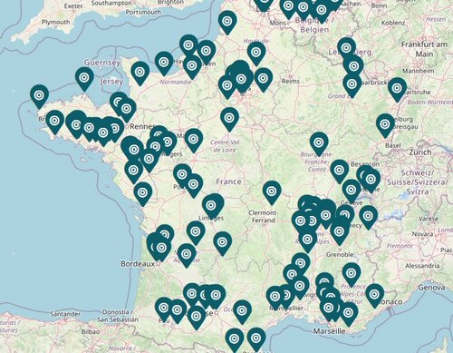 Après une pleinière d’interconnaisance le 6 février qui a réuni 57 personnes, 10 propositions ont été énoncées qui ont commencé à se réunir début mars. A noter l’envie de se retrouver localement qui a donné lieu a 3 propositions de groupes géographique à Lille, dans le sud-ouest et autour de Lyon-Grenoble. La densité des participant.e.s visible sur la carte ci dessous permet d’expérimenter cette hybridation d’un communauté apprenante à la fois thématique (le soin) et territoriale.