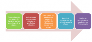 Quatrième étape : Les animateurs de la séance viennent compléter les productions par des apports de contenus, à partir de ressources documentaires fournies par l’intervenant-e, de recherches et de leurs connaissances personnelles. Ils font part également de leur ressenti en tant qu’animateurs : préparation, animation, posture, difficultés rencontrées, points forts et axes d’amélioration.