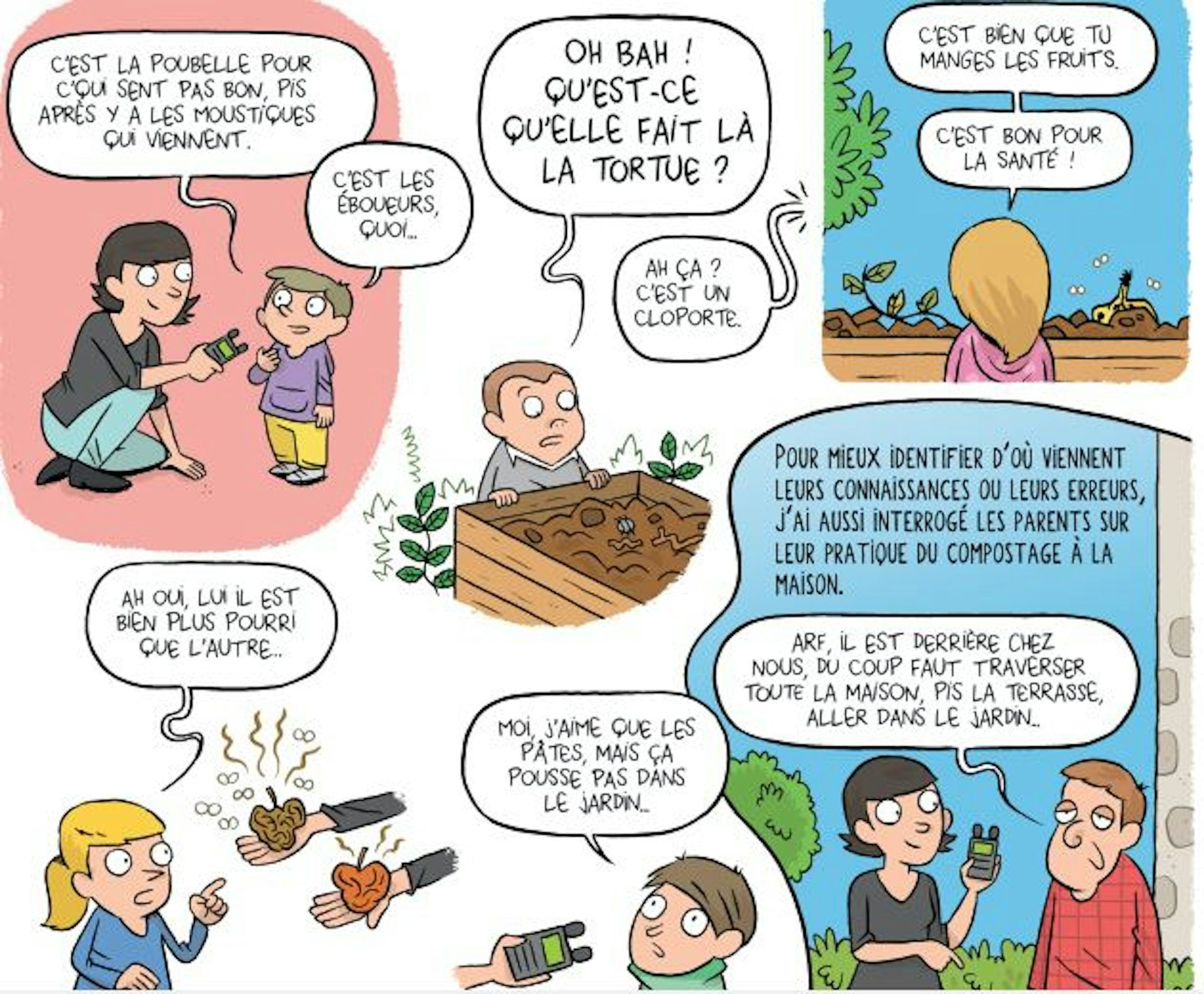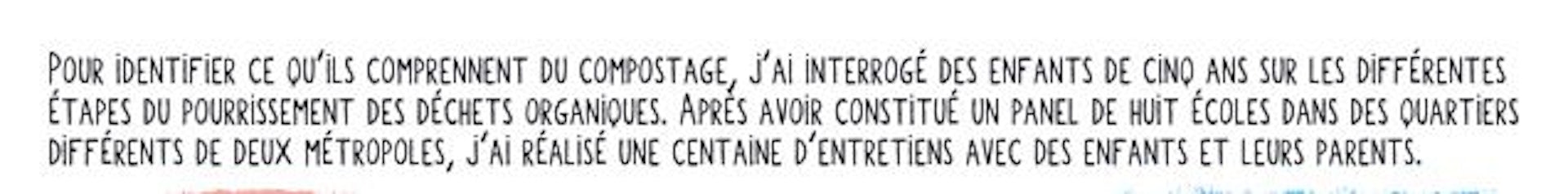 À travers une centaine d’entretiens avec parents et enfants, je cherche à identifier les idées initiales des enfants sur la dégradation des déchets dans le composteur. Comment appréhendent-ils ce processus de chaîne alimentaire en jeu dans le composteur, alors qu’à cinq ans, ils sont en train de construire leur langage et leur compréhension du monde ?